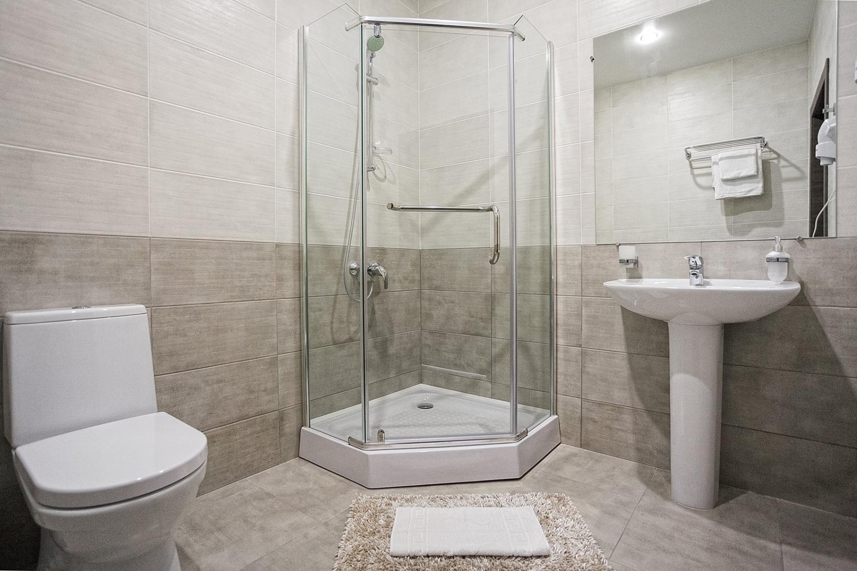 с душевой кабиной ; тапочки ; туалетные принадлежности ; фен ;