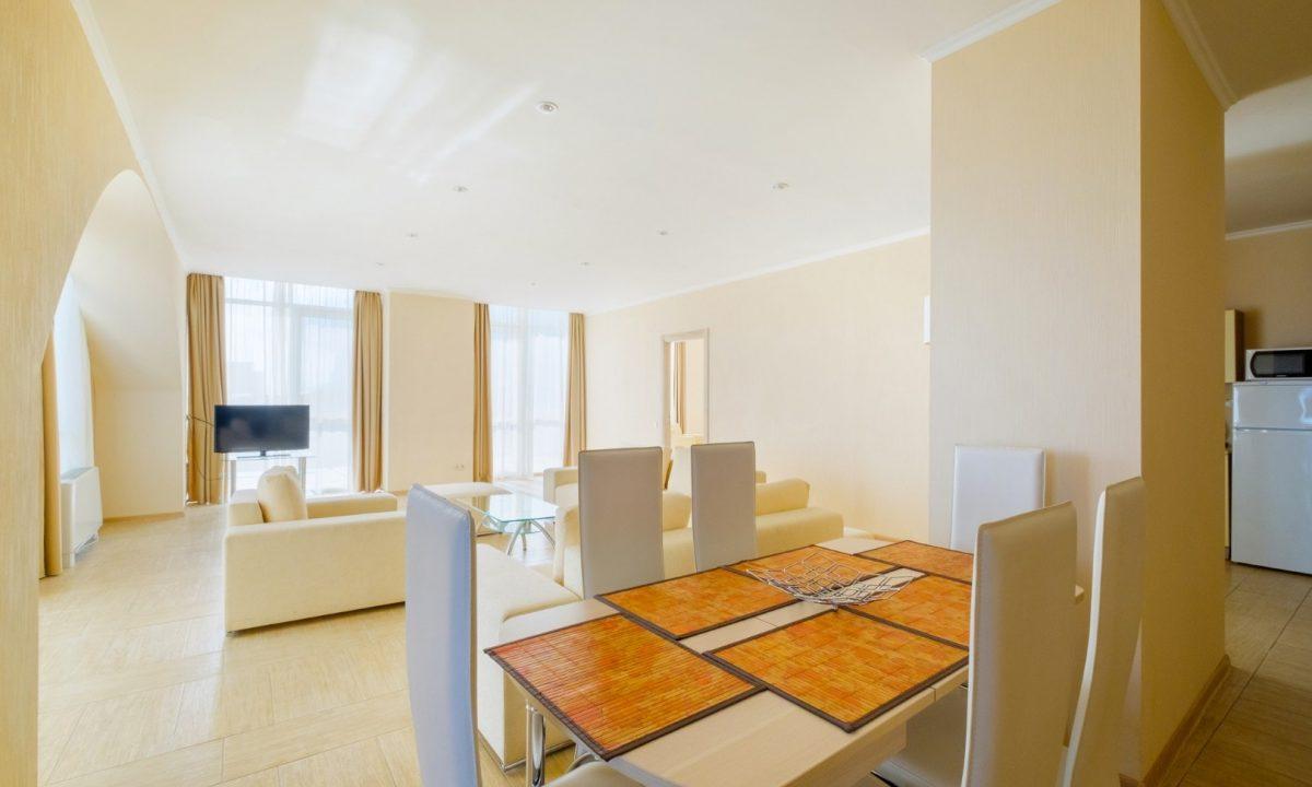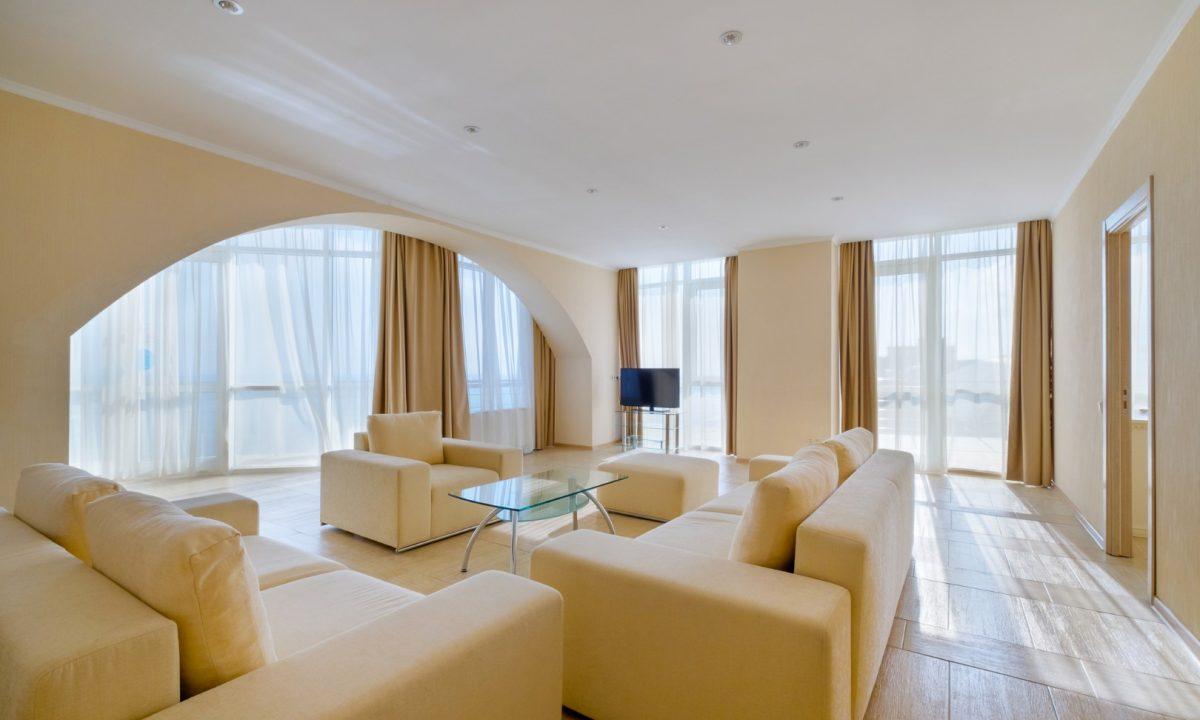 Номер категории ПРЕЗИДЕНТСКИЙ расположен в корпусе БАШНЯ, является единственным и уникальным номером данной категории, площадь которого составляет 120 м?. Роскошный, просторный, необычно светлый номер разделен на четыре комнаты, и включает в себя три спальни и гостевую зону.